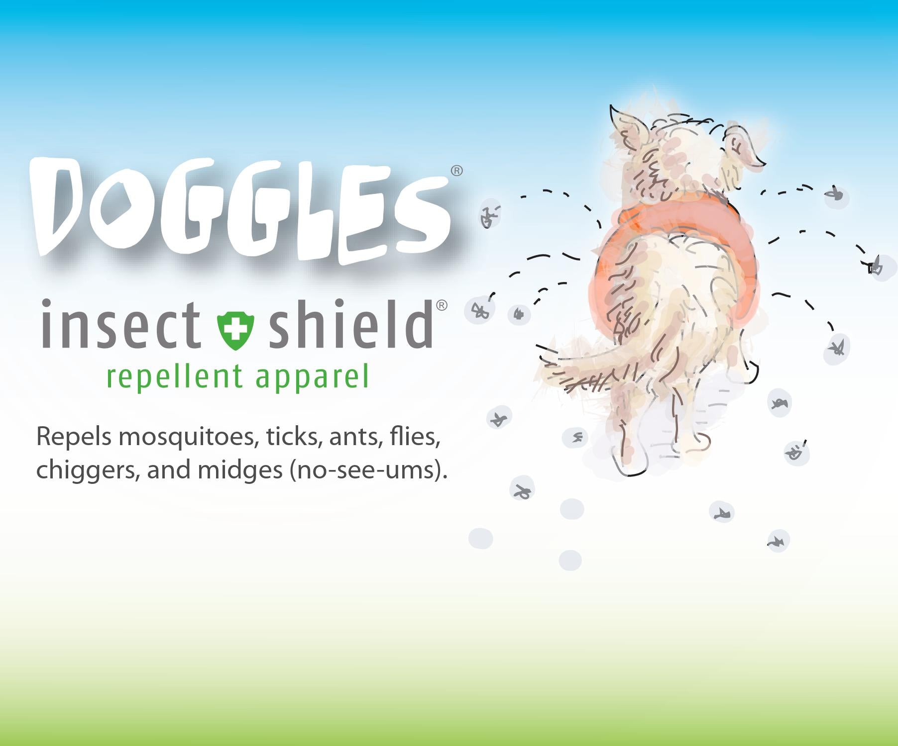 Doggles brings you Insect Shield technology! Bandanas repel mosquitoes, ticks, ants, flies, chiggers, and midges (no-see-ums). PLUS FLEAS! Insect Shield protects against a variety of insects that can carry dangerous diseases. The EPA registered technology is long-lasting, effective, and convenient. Insect Shield uses a man-made version of a natural repellent found in certain types of chrysanthemum flowers. Lasts through 70 launderings. For more information, please visit insectshield.com